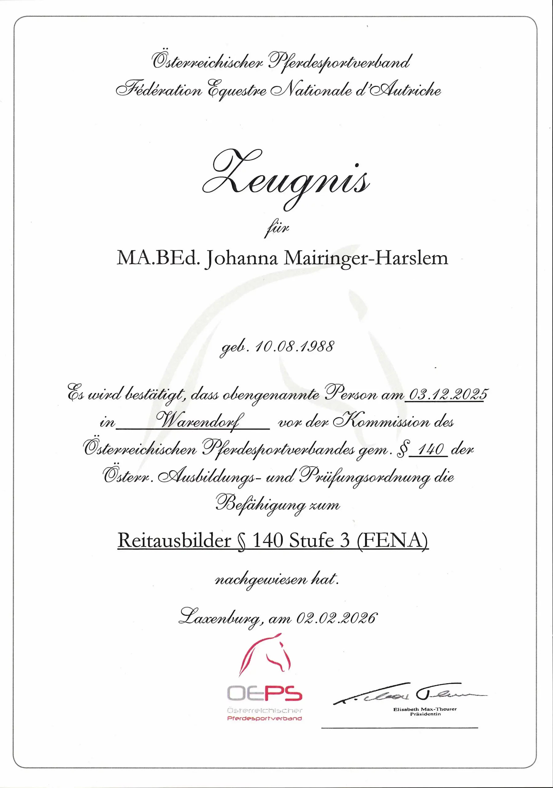 Spring- und Vielseitigkeitskurse absolvierte ich bei Kurt Gravemeier, dazu gewann ich im Bereich Vielseitigkeit in meinem Praktikum bei Ingrid Klimke und Fortbildungen bei Reitmeister Martin Plewa viele neue Eindrücke und Erfahrungen.